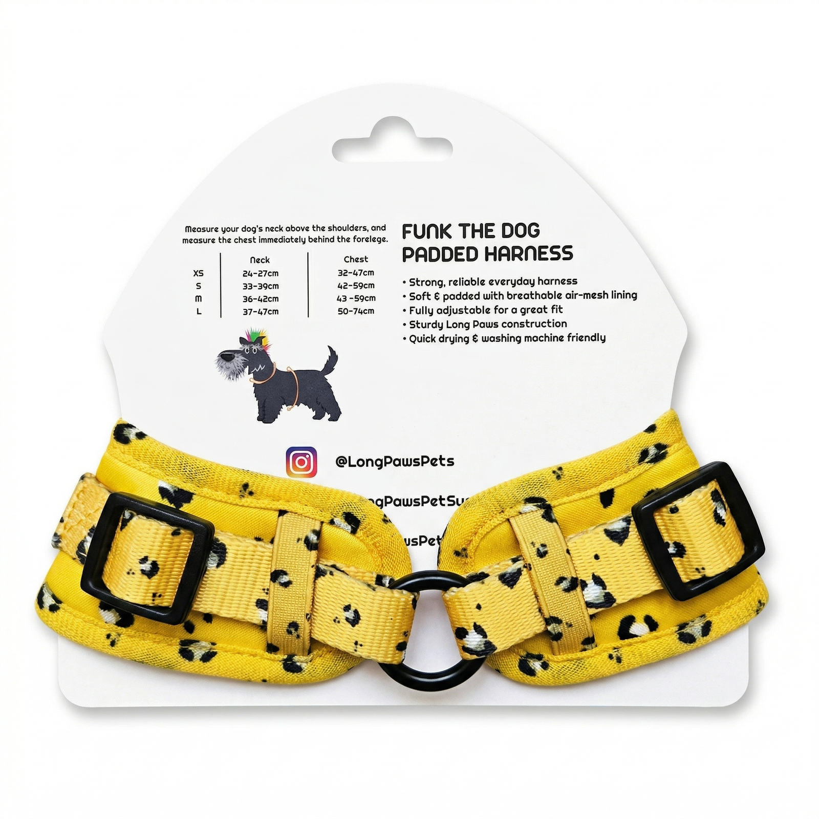 The Long Paws Funk Dog Harness & Lead Set – Mustard Panda is a coordinated walking set designed for comfort, control, and everyday use.