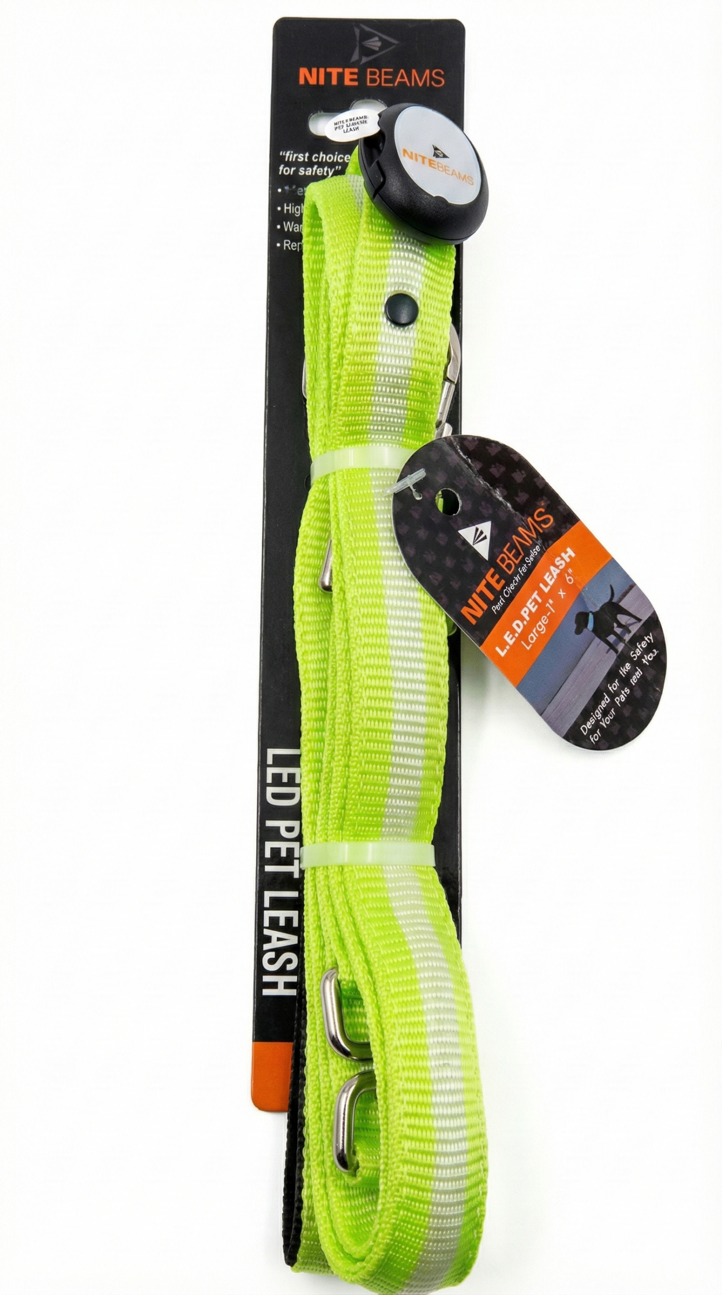 - Nite Beams LED Dog Lead with Built-In Flashlight – Be Seen. Stay Safe. Make every walk safer, brighter, and easier with the premium Nite Beams LED Pet Lead. Designed for maximum visibility, this durable LED dog leash features a built-in flashlight, reflective striping, and long-lasting illumination—perfect for evening, early-morning, or low-light walks.Whether you’re walking in the city, countryside, or dimly lit areas, this lead ensures you and your dog stay visible to traffic, cyclists, and pedestrians.